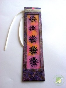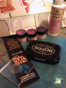 5. Peel off the other protective sheet and glue it together. Taking the StazOn Ink Pad – Ink a stamp and stamp image on one side of the acrylic. Take the Crystal Lacquer and Mixers and Paint the backside of the acrylic. Taking tissue paper used the lacquer and mixers to adhere to the bookmark. Allow it to dry. Add Ribbon and Dew Drop. Find a good book and read!