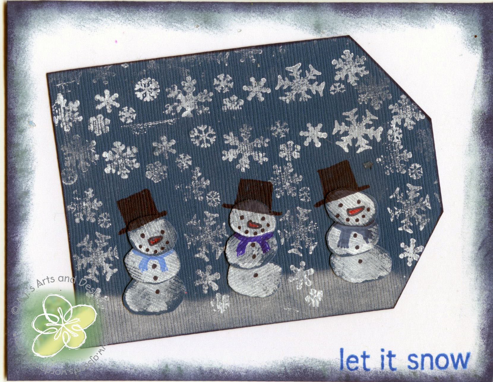Paper: The card is blank 5 1/2″ x 4″ made from white card stock. The tag was from Dark Blue scrap paper. Stamped with Studio G White Pigment Ink and the snow bank was created with Pan Pastels® White, Let It Snow Fiskars Stamp