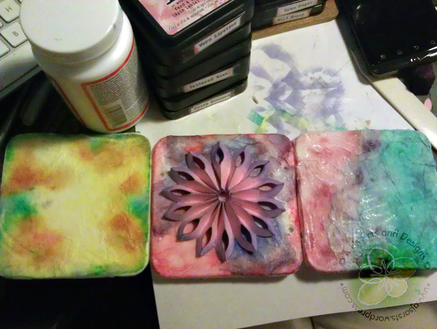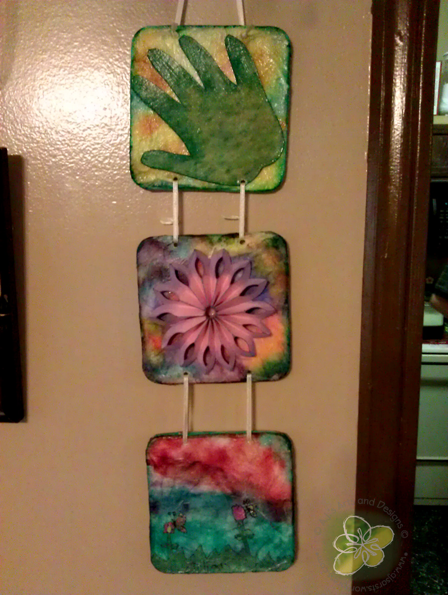 My mom’s – Booga’s Handprint, a flower I made and a drawing the Princess did. The background was created with inked Mulberry Paper Mod Podged to the Resin blocks.