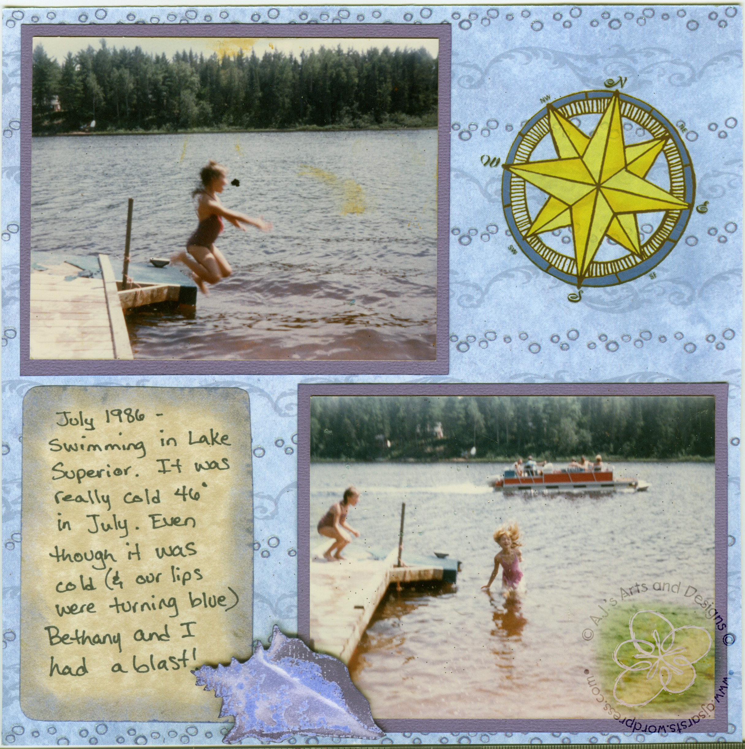I started redoing my childhood album several years ago before the Booga was born but I hadn’t even come close to finishing it. I did my childhood scrapbook 8″s8″ primarily because there are not many photos from my childhood, we did not have a camera (weird to think that some people didn’t own cameras but my parents did not). My grandma and aunt were the photographers so if I really wanted photos from my childhood I am sure I could get copies made. This particular group of photos that I finally scrapbooked was from July 1986, my aunt and uncle took my cousin Bethany and I to a friend’s camp off of Lake Superior for 4th of July weekend. The camp was amazing on Lake Superior, it was beautiful, we swam and even went on a boat. We (Beth and I) played in the very cold Lake Superior it was 46 degrees in July but it was worth the blue lips.