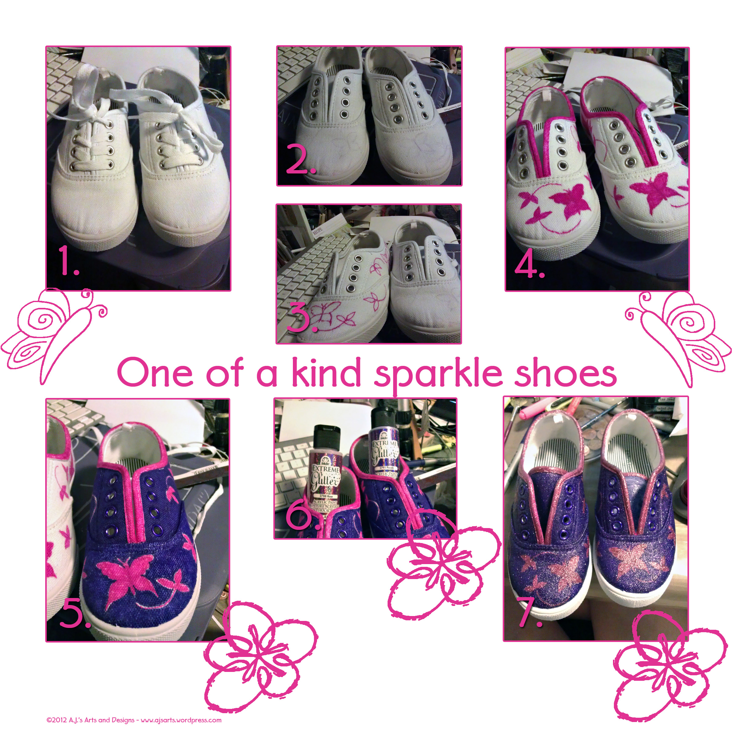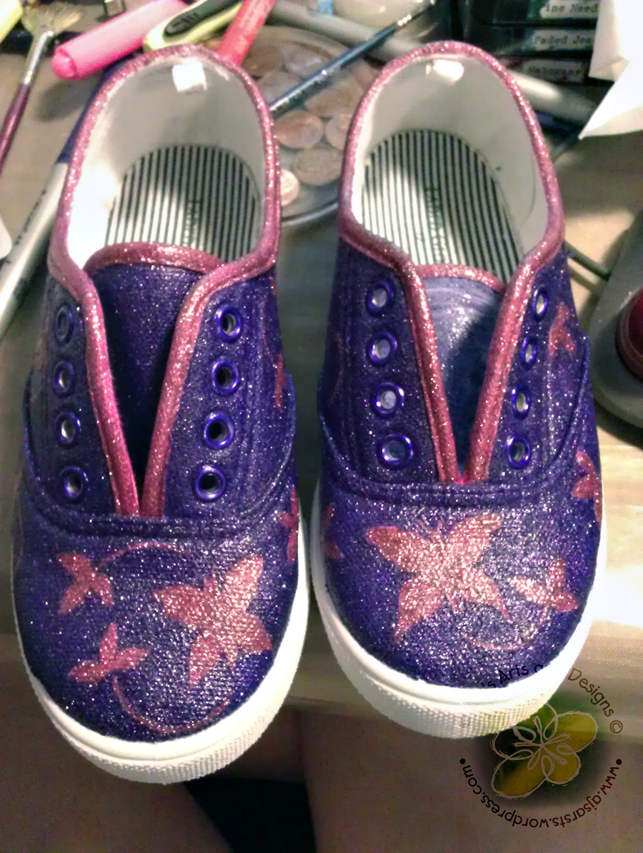 When you have a princess who knows you can paint, no amount of convincing will change her mind when she gets an idea.  She really wanted purple and pink butterfly sparkle shoes, one problem there was no place that makes pink and purple sparkle butterfly shoes.  So I decided (caved) make her a pair of pink and purple sparkle butterfly shoes.