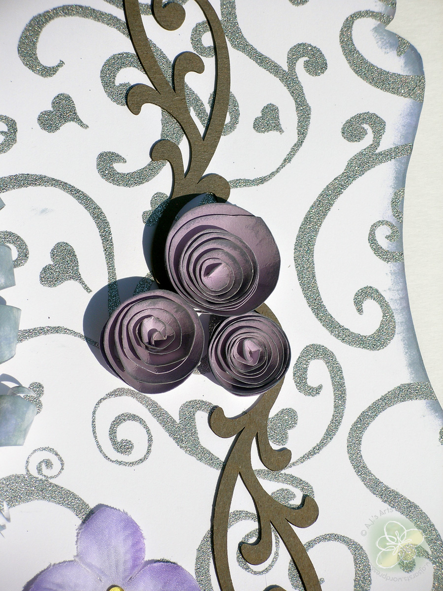 I rolled the flowers and added Weathered Wood to the edges of the flowers to create the “popping” effect. I also added Shaded Lilac to the embellishment pieces from Want2Scrap.