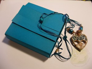 Using copper wire I created the clasps, other embellishments around the beads, I then strung everything with coordinating ribbon. I created the boxes using Robin’s Nest Paper that coordinated with each necklace.