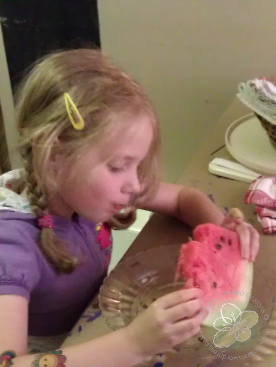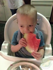 Well it is my kids favorite time of year WATERMELON SEASON! On Saturday we went to the library driving past the little Farmer’s Stand where the watermelons were piled high. On the way home we had to stop to get a watermelon and in Booga’s case peaches (one didn’t even make it to the car). They had corn (oh was it sweet just like candy), green beans, tomatoes (oh they are so good) and cucumbers (yes we got them all).