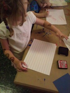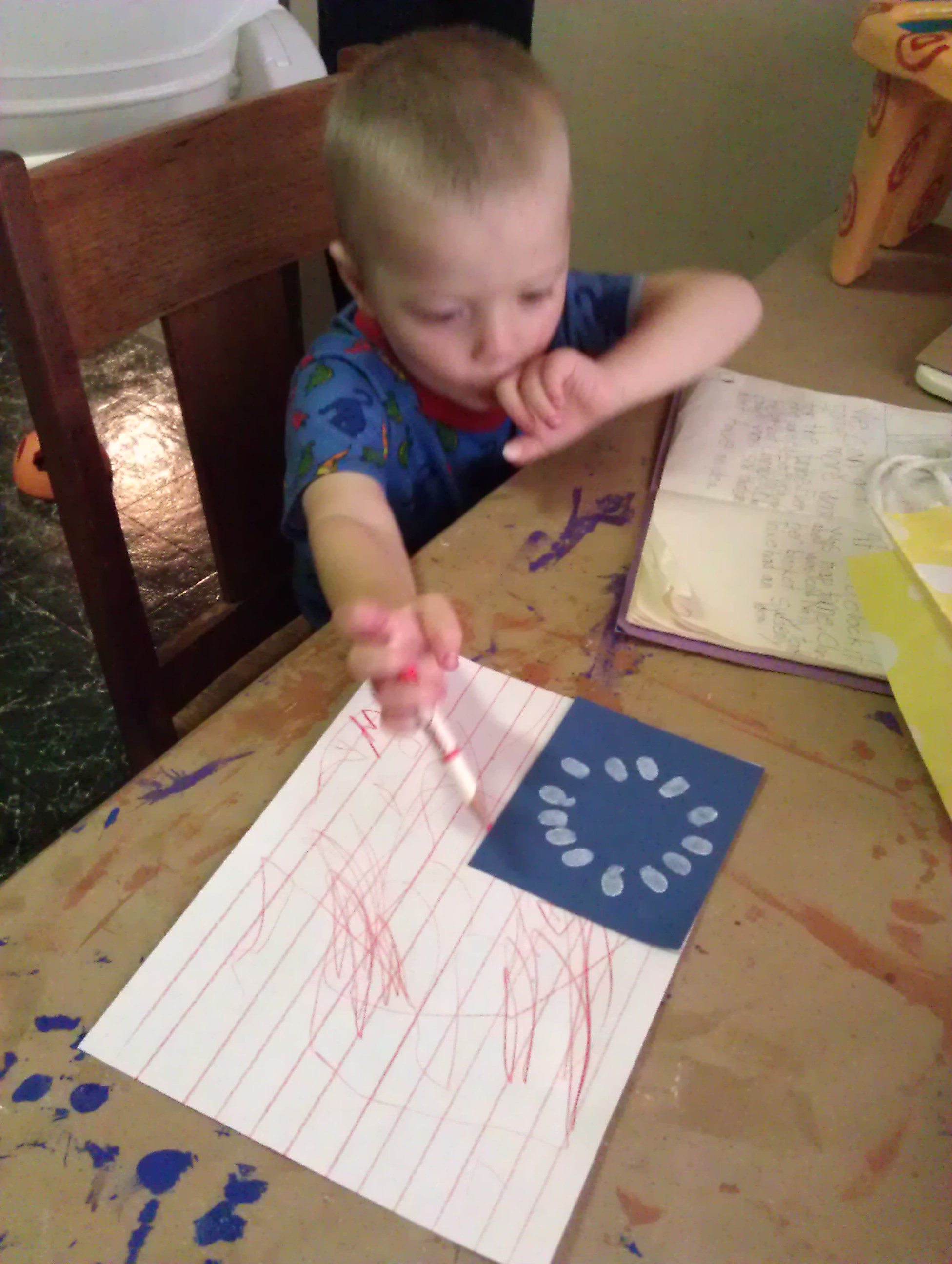 2. Taking the blue marker or pencil draw a circle in the center of one of the blues squares. Using the white ink pad, ink finger and stamp 13 fingerprints around the circle. The other square have the older child count and print 50 finger prints. Glue square onto the upper left hand corner of the flag.