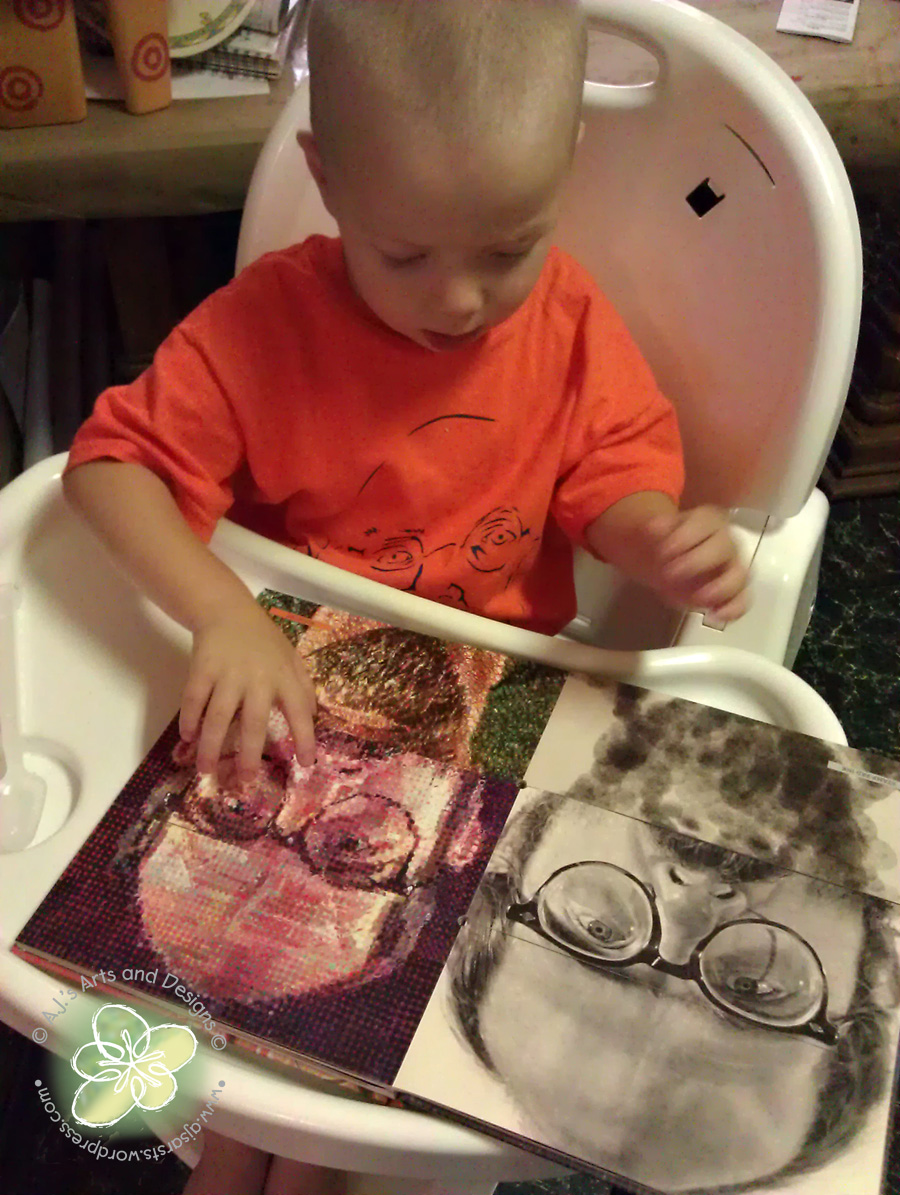 Freezer Paper Stencil Chuck Close T-ShirtBooga has a small obsession – okay a HUGE obsession with the artist Chuck Close.  It started Tuesday when we visited the local library and I grabbed a NEW book on Chuck Close – Chuck Close Facebook.  Little did I know this book would start an obsession.  I looked through the book (relaxing on the couch) and thought it was fantastic, Booga did something he has never done he stood over my shoulder and look at the whole book with me.