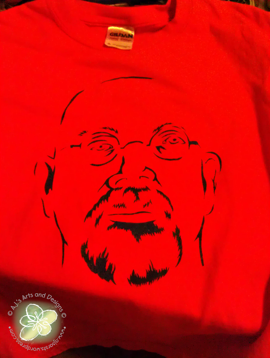 Booga’s Finished Shirt – the paint is Navy Blues Puffy Paint that I painted on using a stencil brush.  Not too shabby, my goal was to make him not look like the guy from Breaking Bad – lol!