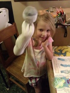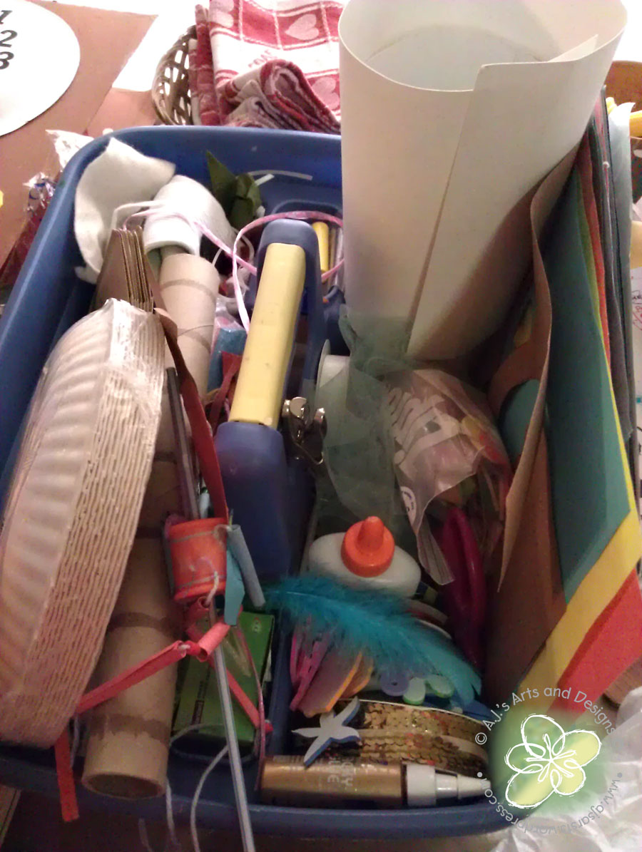 We have been frequenting the library quite a bit this summer and one of the books I checked out was, “Simple Puppets from Everyday Materials” by Barbara MacDonald Buetter. I thought this would be fun to make one or two puppets with the Princess, I had not planned on making every puppet in the book (which I am now pretty sure, will happen). I decided we (I) needed a “supply” box of puppet making materials – I thought this would benefit the Princess (I mean me) from frantically trying to find stuff during the creating process.