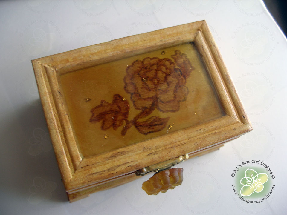 My last post I talked about how I love our local library because of all the amazing How-To books you can find. The book I found was called “The Art of Resin Jewelry” by Sherri Haab, let me just state I need to add this book to my vast how-to collection. The faux Amber technique was taken from the book and it worked amazingly. The box was a wooden box that I painted to look like Birds Eye Maple, the flower I colored with Bic Mark-its before adding the resin.