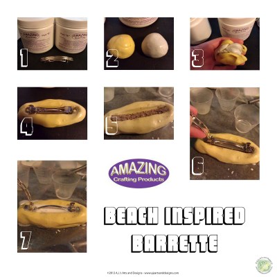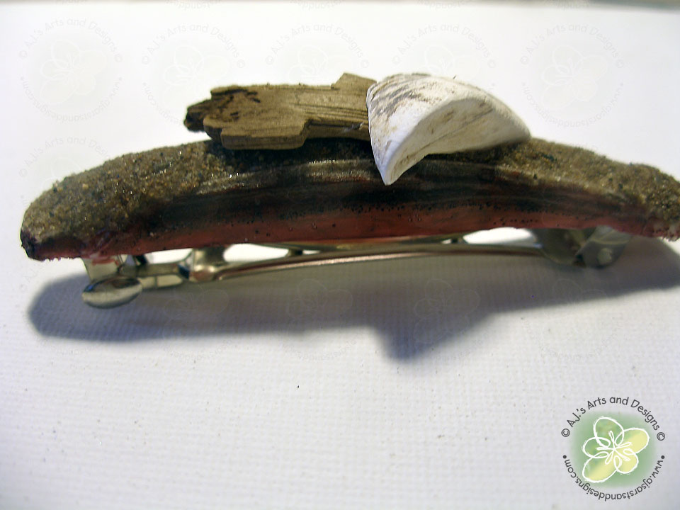 7. Un-mold barrette. Color the sides with a brown Bic Mark-it and add the drift wood and shell to finish the piece.