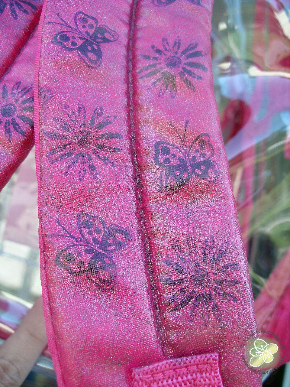Close up of the Strap on the backpack painted with PLAID® Extreme Glitter. Stamped with Staz-on Ink Pad.