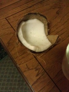One thing I have wanted to get for a while is a coconut. I love fresh coconut when I was in college I would buy one at least once a month. I would fight every time to get it opened but it was so worth it. Yesterday I went through and decided it was time to crack that thing opened. I took it outside (concrete works the best) along with a sterile flat head screw driver and a hammer. I hammered the screw driver into the “soft spot” of the coconut, twice so it will drain easily. Surprisingly that only took me 5 minutes (my neighbors probably think I am insane, which is nothing new – lol). I brought the coconut inside and drained the liquid out of it.