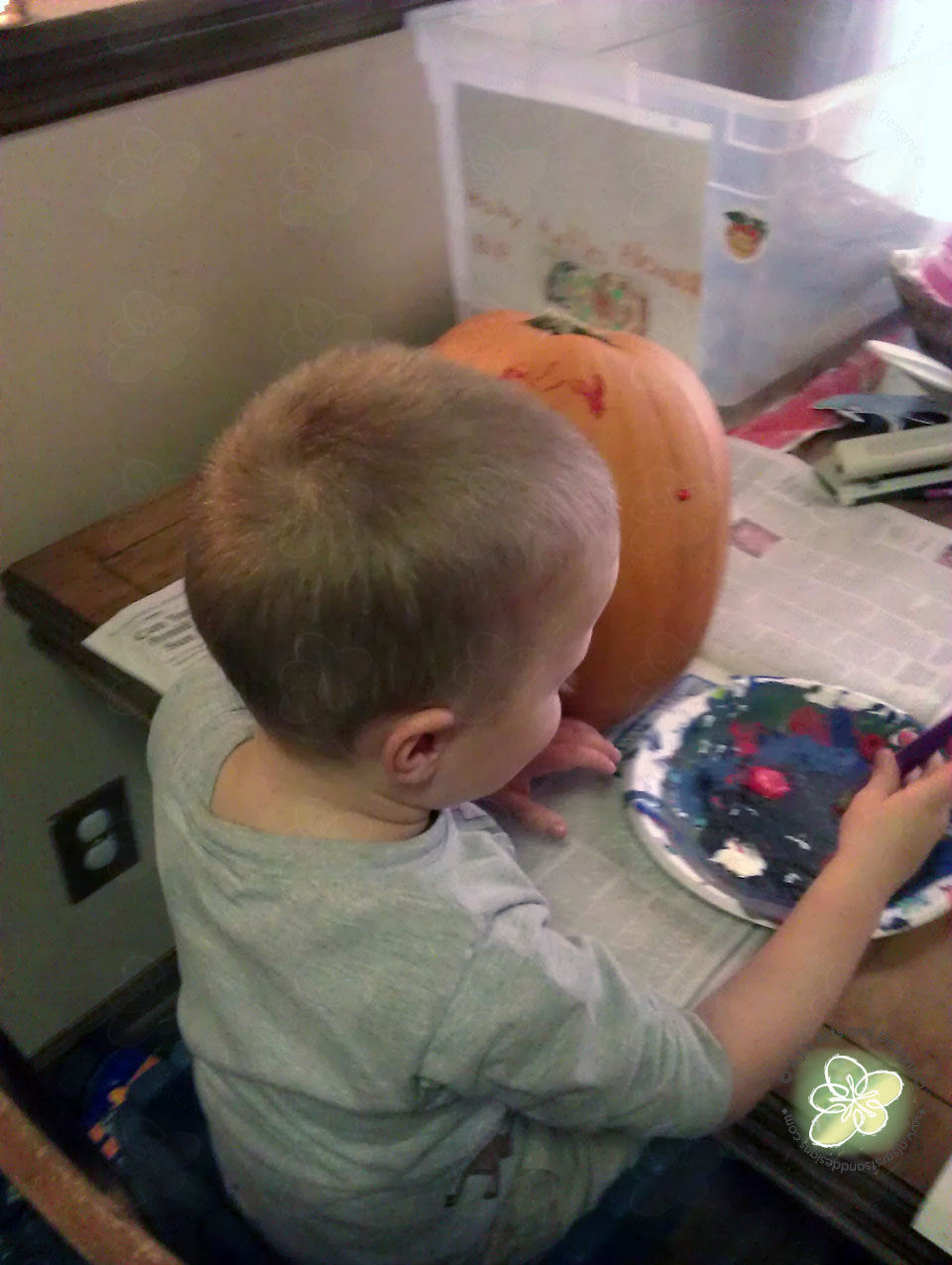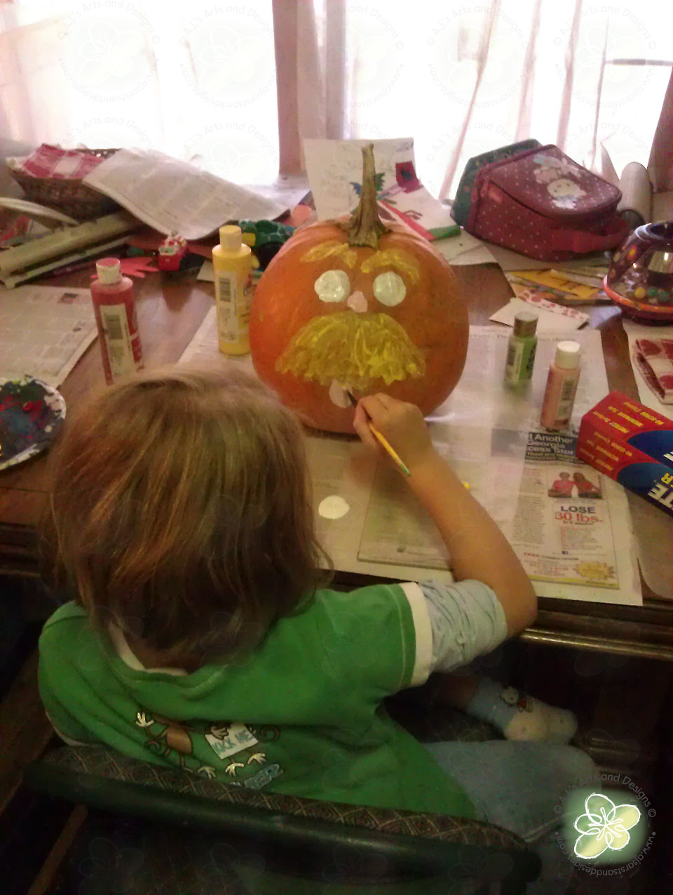 This is the first year both kids wanted to paint pumpkins (which me very happy.) Last year only Booga painted a pumpkin and the princess’s pumpkin died on our kitchen table. The princess really wants to enter her pumpkin into a contest at school, she decided to paint the Lorax on her pumpkin. Booga decided to paint Chuck Close on one side and James (the train) on the other. We got our pumpkins from the local farmer’s stand, the kids loved picking them out (I forgot to take pictures). Of course once we got them I knew we would be doing them Sunday after our Girl Scout function, since we didn’t get to the Farmer’s Stand until Sunday.