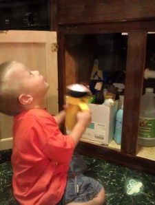 So I hang up with my dad (knowing in 20 minutes my dad would be calling to check up on me) and I called my neighbor to see if he had a basin wrench. He did and I was thrilled so Booga nad I went to the neighbor’s house to get the wrench. We got home, Booga and I tried to get the washers off I just wasn’t strong enough to get the washers to move. I sprayed them with WD-40 for a second time and let them sit till Jeff got home. Jeff got home and was a tad shocked at the state of the kitchen.
