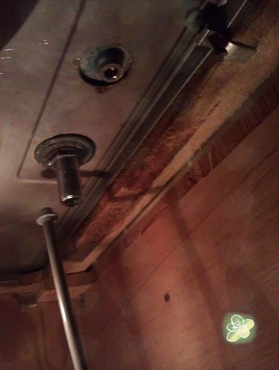Booga and I started the project on Saturday after Jeff and the princess went to a birthday party. I broke the cardinal rule when doing plumbing – I didn’t look to see exactly how bad everything was before I purchased everything (I also didn’t have a basin wrench). We knew the faucet was dying on a slow death but neither of us thought it was leaking that bad or anything else was leaking. When I removed everything out from under the cabinet, it was wet meaning it had been wet for a while and we had another leak. My heart sank because I knew it was more than just the faucet. I also got up under the sink and noticed the extremely rusted washers and the broken plastic washer. I realized there was no way my faucet would be completely finished before Jeff got back and now my kitchen was a huge mess. I worked for 30 minutes with a wrench and I finally called my dad (because that is what I do when I don’t know how to do something).
