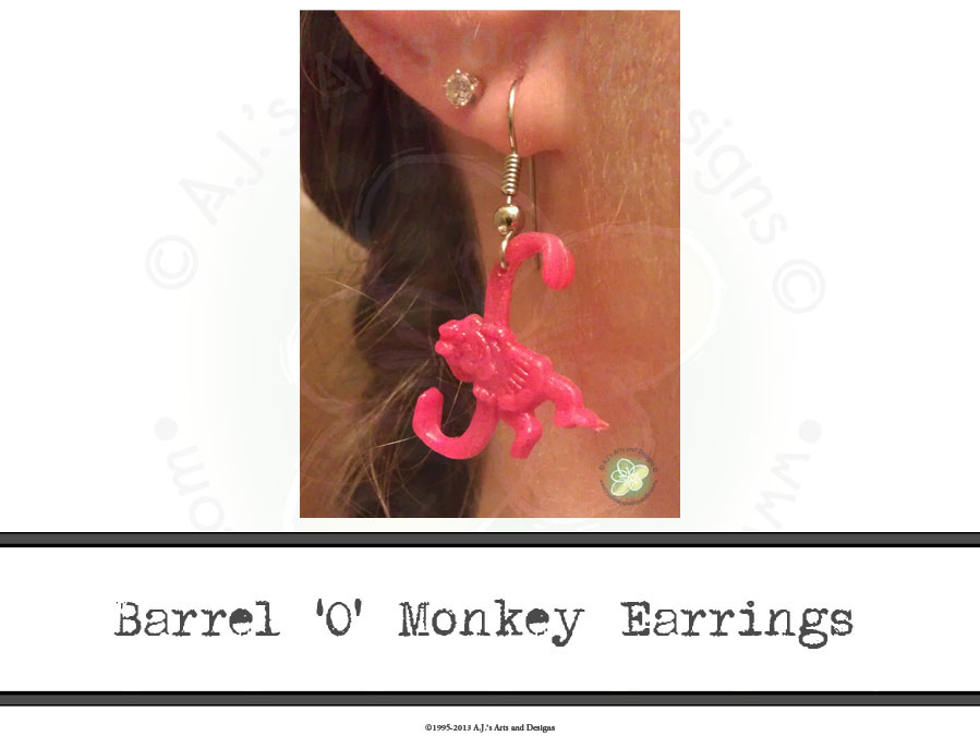 We walk almost every day to school and from school it is a nice walk about a mile but it gets us all moving. I started walking in the mornings when we got Reeva, Jeff use to take the kids and I would stay home and drink my coffee. It can be a tad difficult to maneuver a stroller with a Booga, a 7 year old and a doggie (I know I do it almost every afternoon if Booga doesn’t sleep too late.) I always look at the ground in hopes of find money that is how I made our penny coasters. We were walking one morning and I came upon monkeys from the Barrel O Monkeys Game but they were baby monkeys. I picked them up and shoved them in my pocket I was so excited. I then hear Jeff say, “You are going to make earrings out of those monkeys aren’t you.” My husband knows me too well, he then said, “If you wouldn’t have been here this morning I would have picked them up for you.” YAY – my husband sees cool things on the street and knows immediately what I can make with them. This was a super easy project and was free!