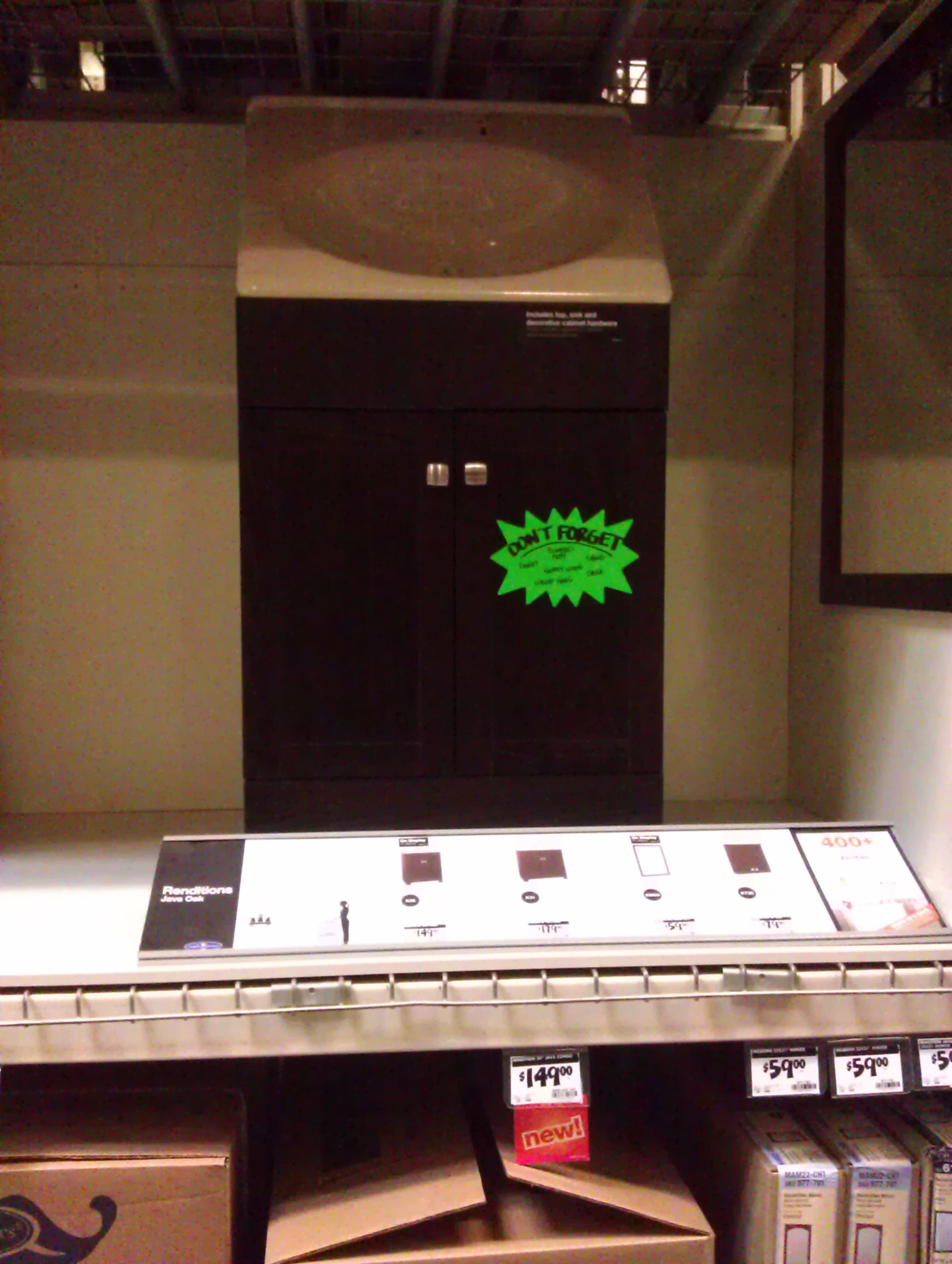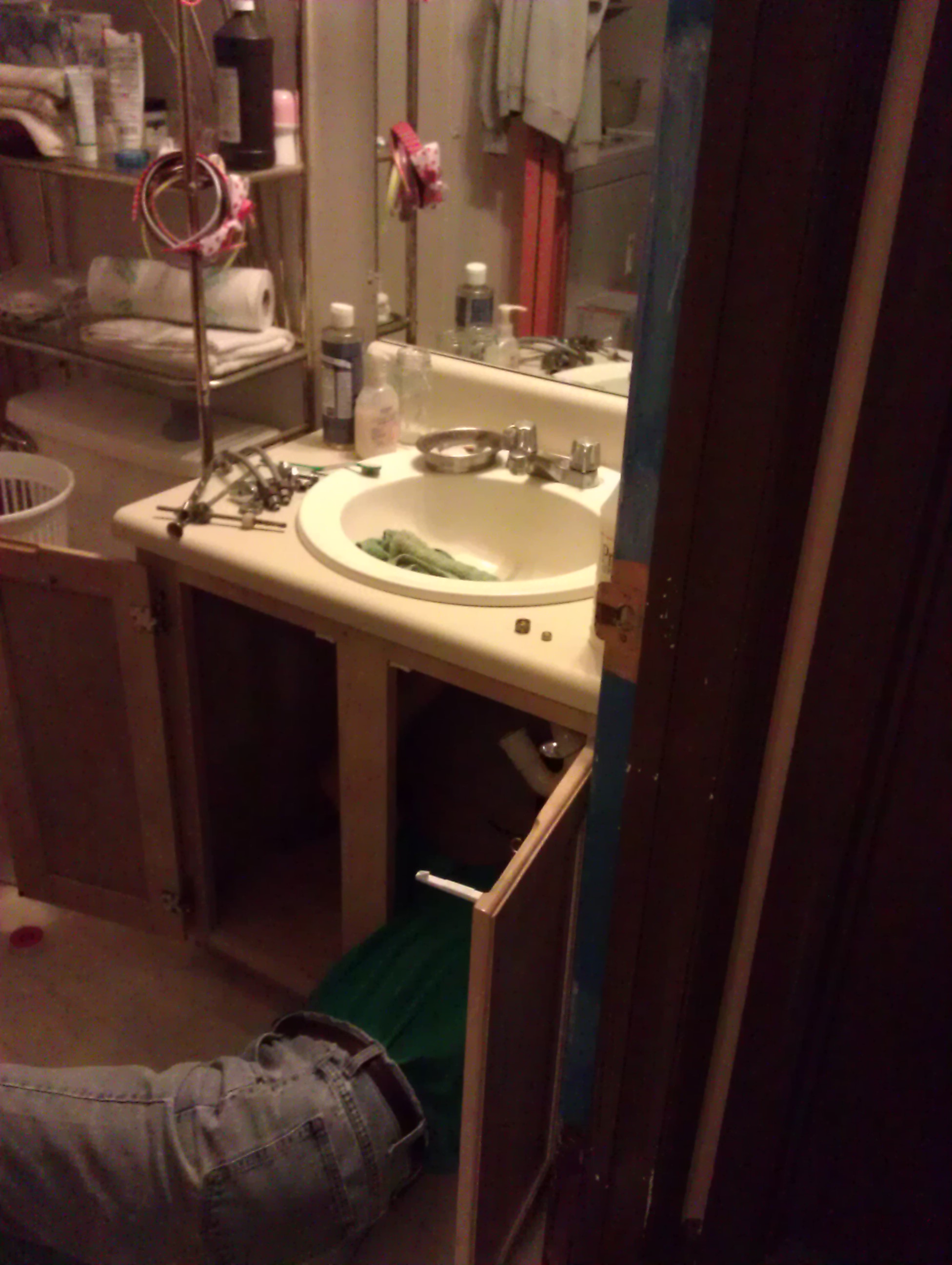 Jeff trying to fix the faucet. did I mention the cabinet was actually an old kitchen cabinet that they transformed to a bathroom vanity. I would have had no problem with this if they had done it correctly.