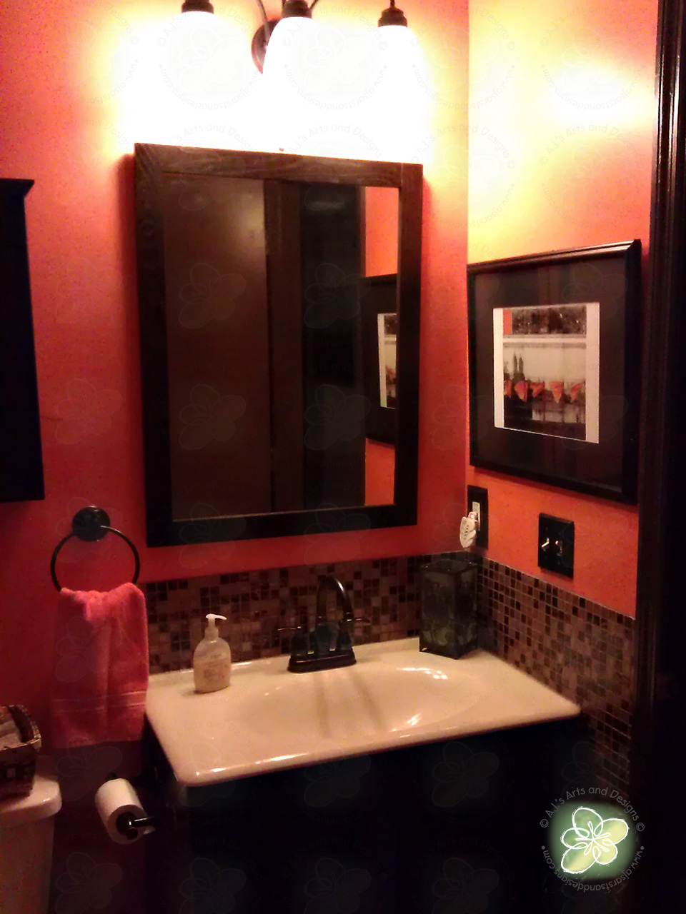 AFTER: The mirror, picture (is a print from The Gates, which the orange matches) and another candle holder on the sink.