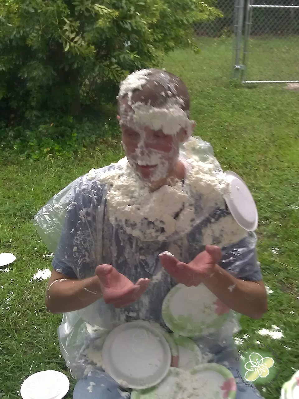 Jeff is such a great sport he let 22 first graders (and some adults) throw Whipped Cream Pies at him. HUGE HIT!