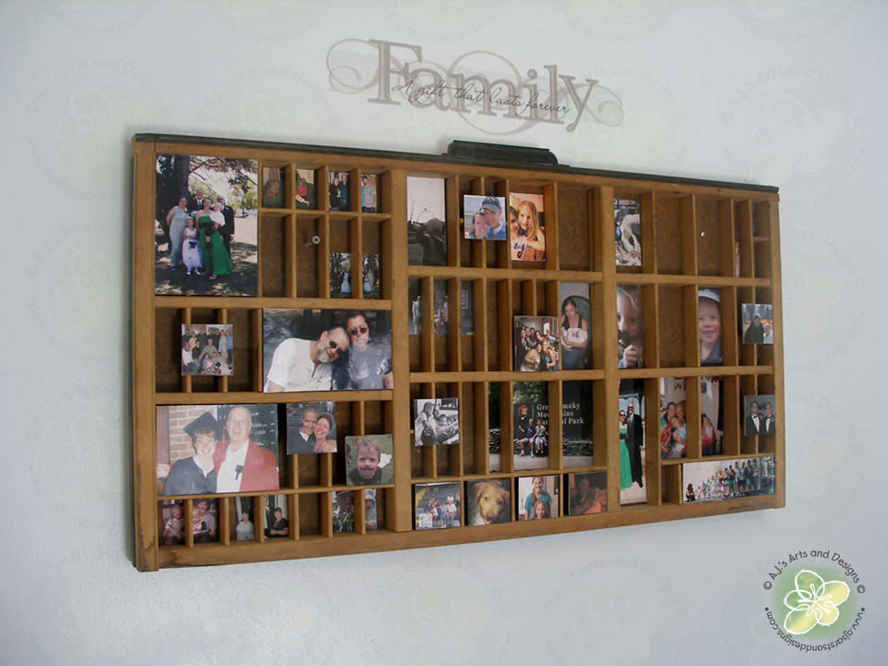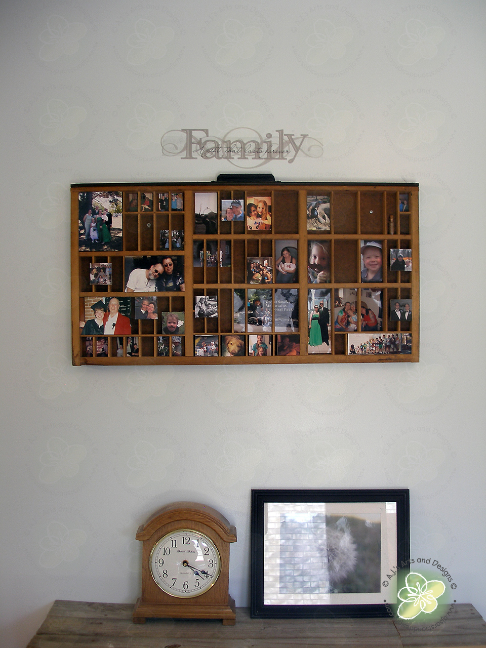 Several years ago Jeff bought a printer typeface tray for me. I had it hanging in my then “studio” and in Booga’s room for a while. When we finally moved Booga into that room I removed the shelf and it went in the closet. Originally for the living room wall I was thinking about a nice Martha Stewart Style arrangement with the frames and perfectly staged photos. There are several problems with that one being we don’t have any professional photos of the four of us, well alone the rest of the family. My arrangement was stuck to the wall and there it stuck for over a week. It finally dawned on me I could use the printer’s typeface tray, after much searching Jeff found the tray in the back of Booga’s closet.