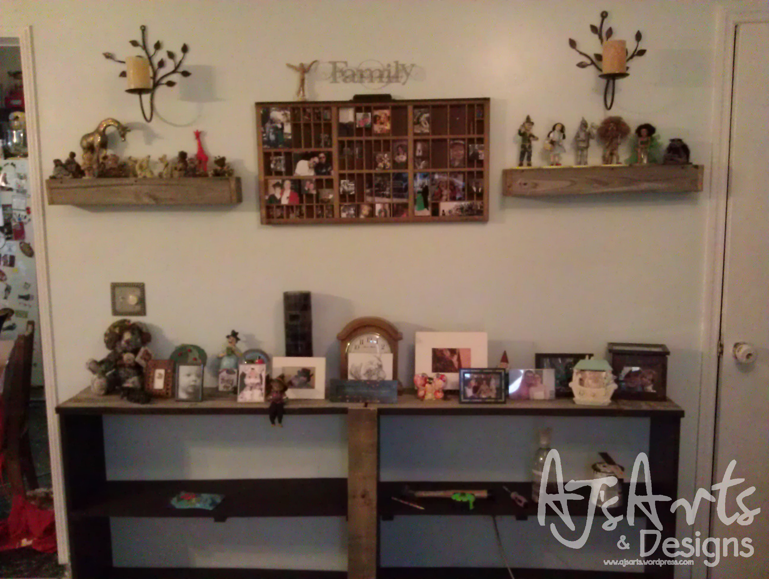 I added a coat of polyurethane once they were on the wall just to seal the shelves. Finished shelves.