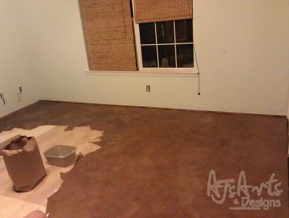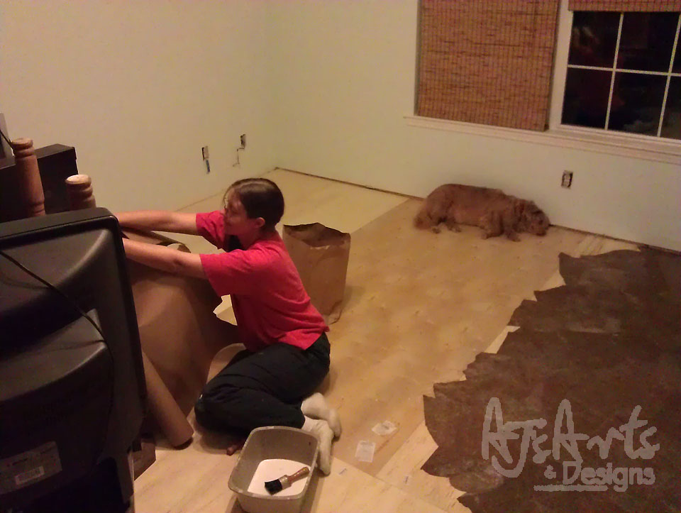 Many of you know I am cheap and the thought of spending $2000 on hardwood floors seemed a tad ridiculous.  Don’t get me wrong I love hardwood they are beautiful but in my world completely impractical.  I have a dog, a Princess and a Booga, my concern lies mostly with the dog and a Booga who chases her throughout the house.  I envisioned the floors laid and Booga pulling out a ball point pen and scribbling on my floor or Reeva scratching the floor because Booga was chasing her.  Better yet Jeff and I moving furniture and the felt foot comes off and we tore up the floor.  Those nightmarish scenarios ran through my head repeatedly.  The price tag also was a complete turn off and I really didn’t want laminate because we already had a mold problem.  A while back I pinned a paper bag floor and told Jeff as a joke hey we should do this.  I revisited the Paper Bag Floor when we ripped up 364 square feet of carpet.  I figured if nothing else it would be a stop gap until we could do something in the spring.