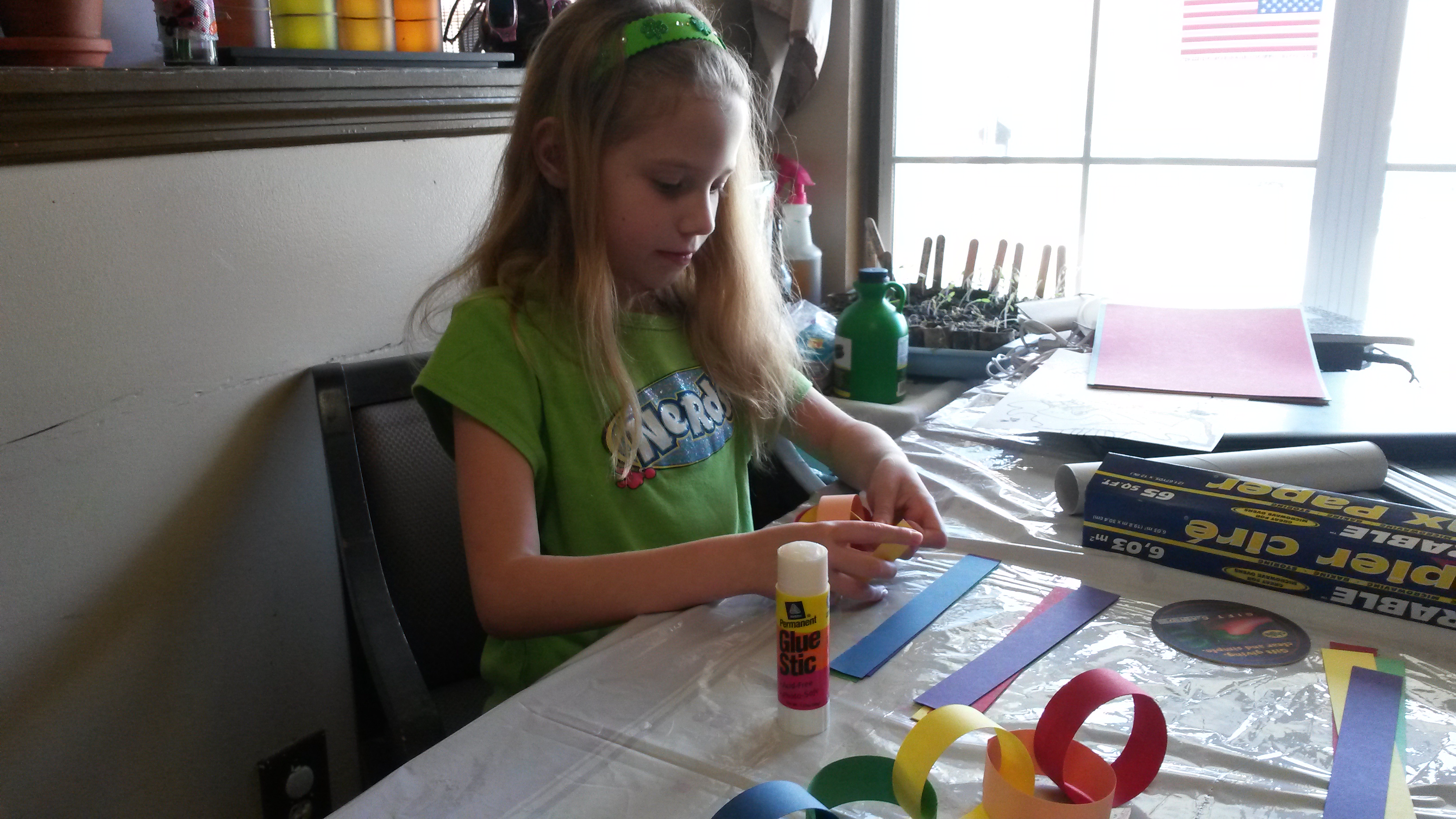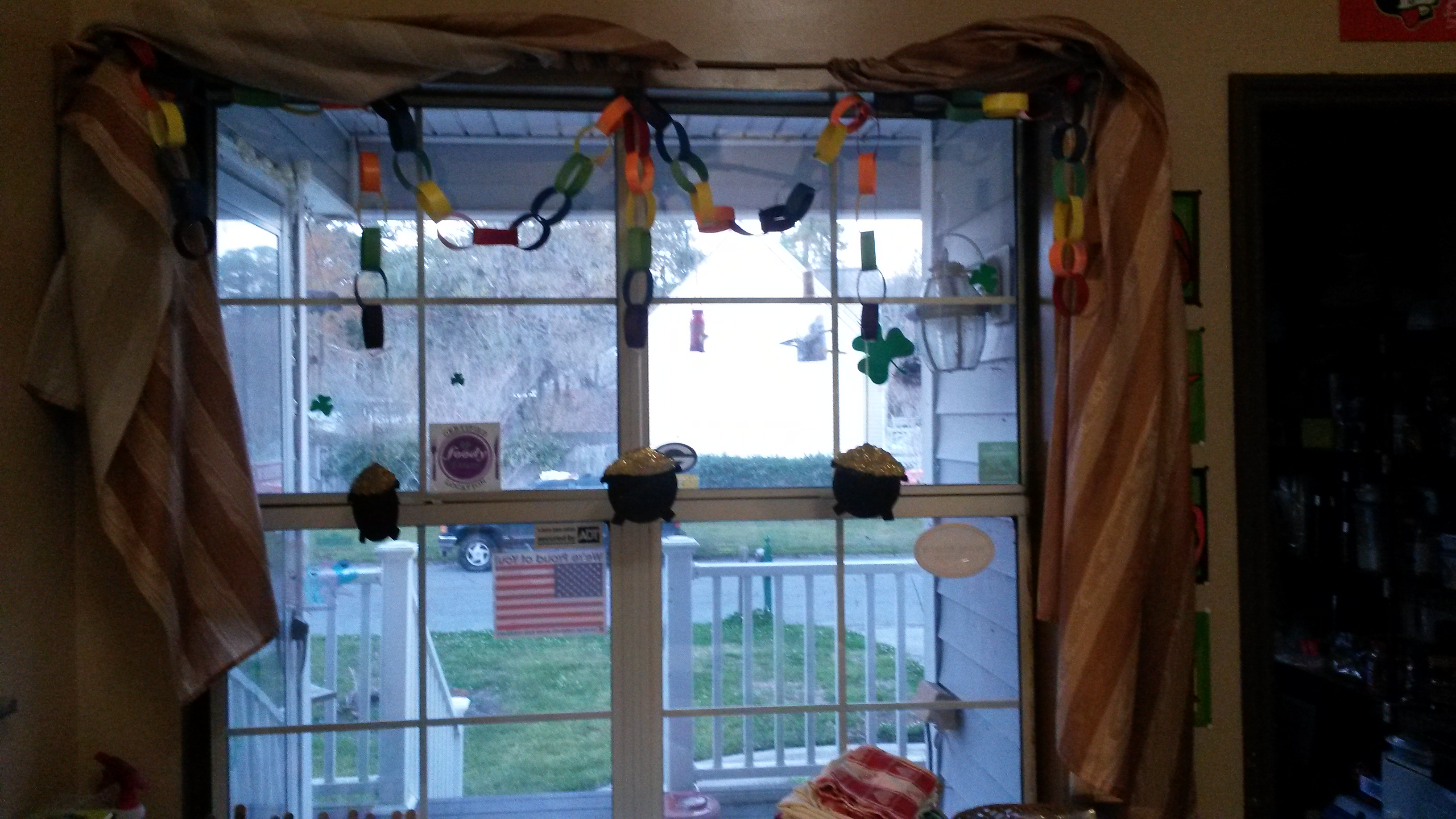 It is Spring Break which means I have been trying very hard to keep the kids occupied without electronics (TV or Kindle). The Princess pointed out our house lacks of St. Patrick’s Day Decor and we needed to make some. I told her to come up with some ideas and we would make it. The project she came up with was rainbow ribbon, twisted and had gold pots hanging from it. One problem mom does not have every color of ribbon in the thickness she wanted (I had red) I told her there had to be a way to make her idea with paper. After a while she came back and asked if we could do a rainbow chain with the gold pots. I told her yes and with the paper chain the Booga could help too.