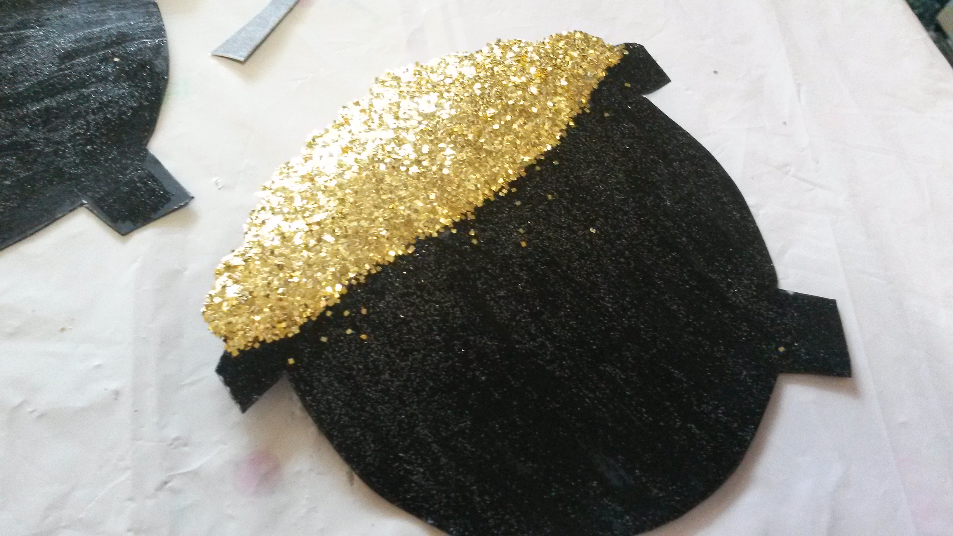 Gluing ribbon to the back side of the pot glue two pots together creating a very glittery front and back. Once the pots dry attach to the 3 rainbow chains that hang down.