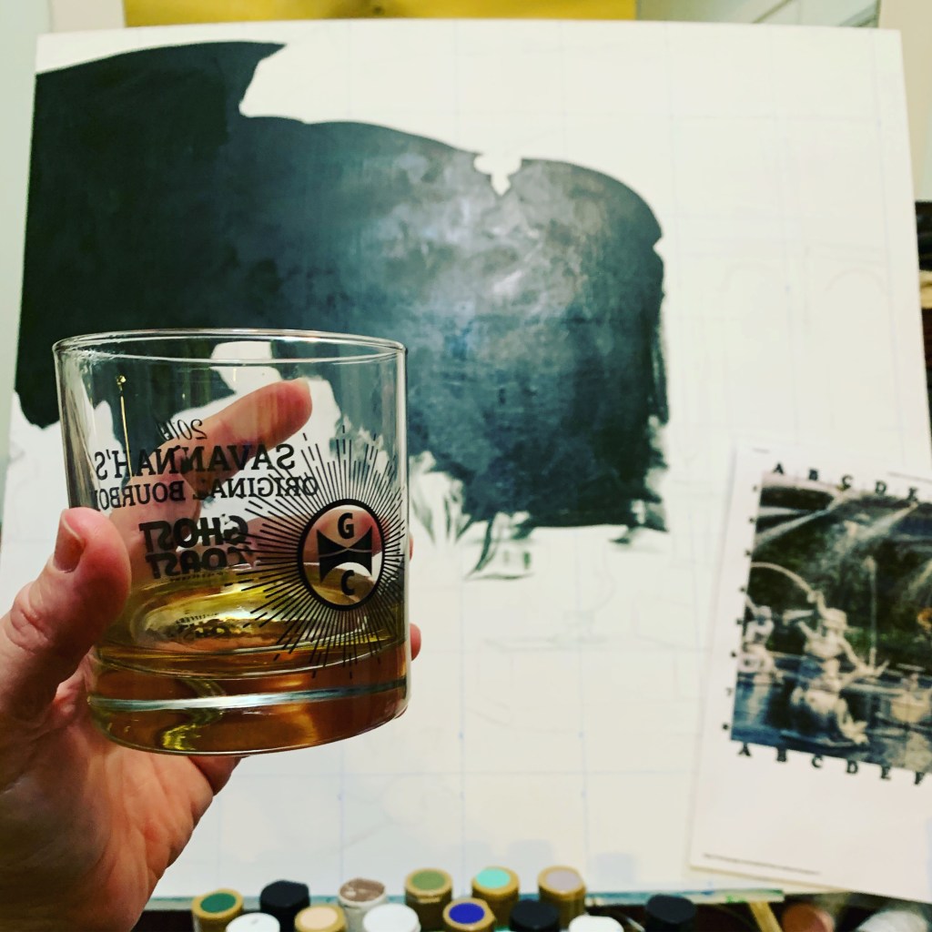 I have never shared this story because my Grandma Helen swore me to secrecy. My granny (which is what we called her) passed last year, so I think I am in the clear now of granny’s wrath (I will let you know if she haunts me). My granny bought my booze when I was in high school. I would always tell her get me whatever, she bought me the cheapest scotch imaginable (seriously, it was paint thinner – I think she was trying to drive me away from drinking). I would hide in in the bottom of my paint cabinet (I don’t think my parents ever found it). This stuff was one step above moonshine, it would put some hair on your chest. I never told a soul, I would sit with my plastic Tupperware orange cup, drink cheap scotch (if you can call it that), listen to Tupac and paint big. Tonight was the first night in 25 years I have done this. With tears in my eyes, I can tell you I have not had this much fun painting in a long time. However, my scotch is much higher quality. It also is bitter sweet because I miss both my grandmas so damn much. Fun fact: during the writing of this blog post “Good Riddance” my favorite song (the Green Day Version) played by Glen Campbell (someone granny played often) on Spotify – I think she approves – lol.