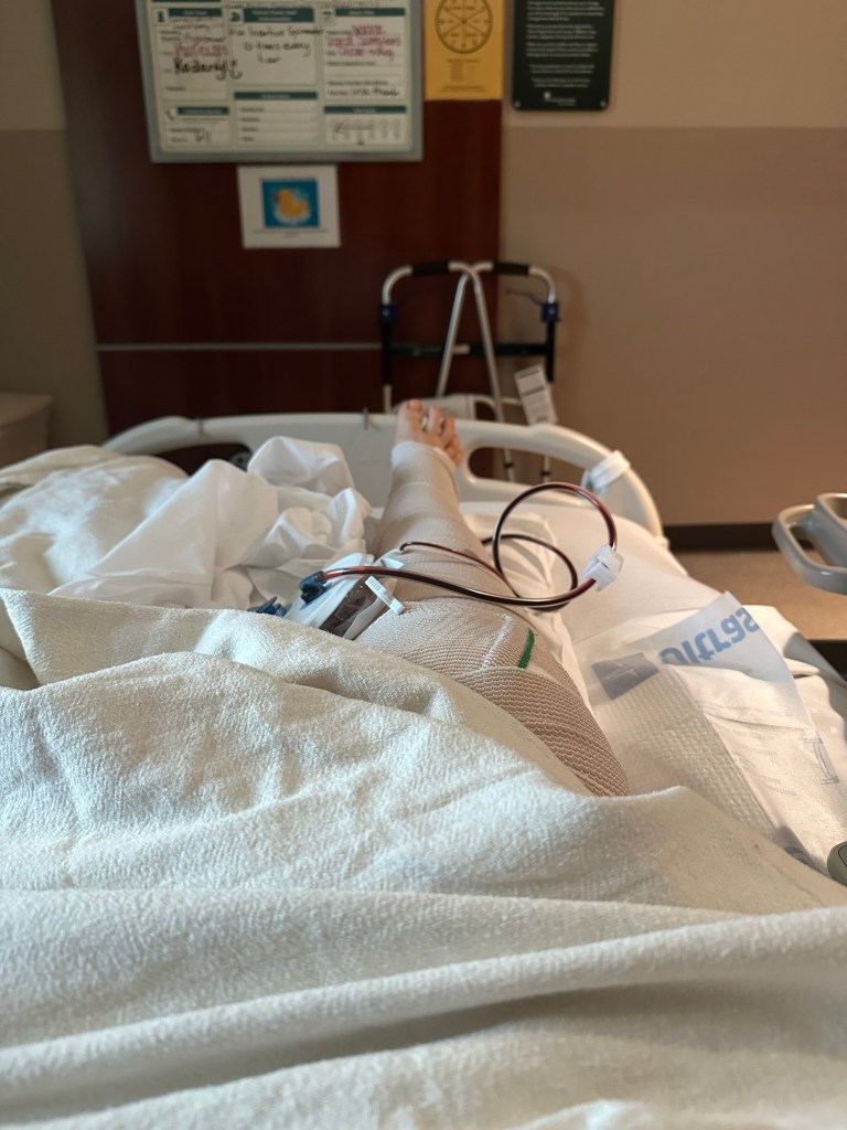 Well, I had surgery on Monday. I no longer have the rod on either side of my leg. Tried physical therapy today unfortunately with my physical therapy I almost passed out because my blood pressure dropped. I have something called postop hypertension so it causes your blood pressure to drop when you stand up right I’m gonna try physical therapy tomorrow. They’re pumping me full of fluids so I can be released from the hospital. Dad is on his way. He left around five this afternoon. my neighbors can visit me today. They brought me McDonald’s and got my big Mac, which on the shake and my french fries very happy about that. I have a Walgreens list going that Jeff said he would pick up tomorrow after school, hoping to be able to go home, but they’re not gonna release me until I don’t pass out standing up.